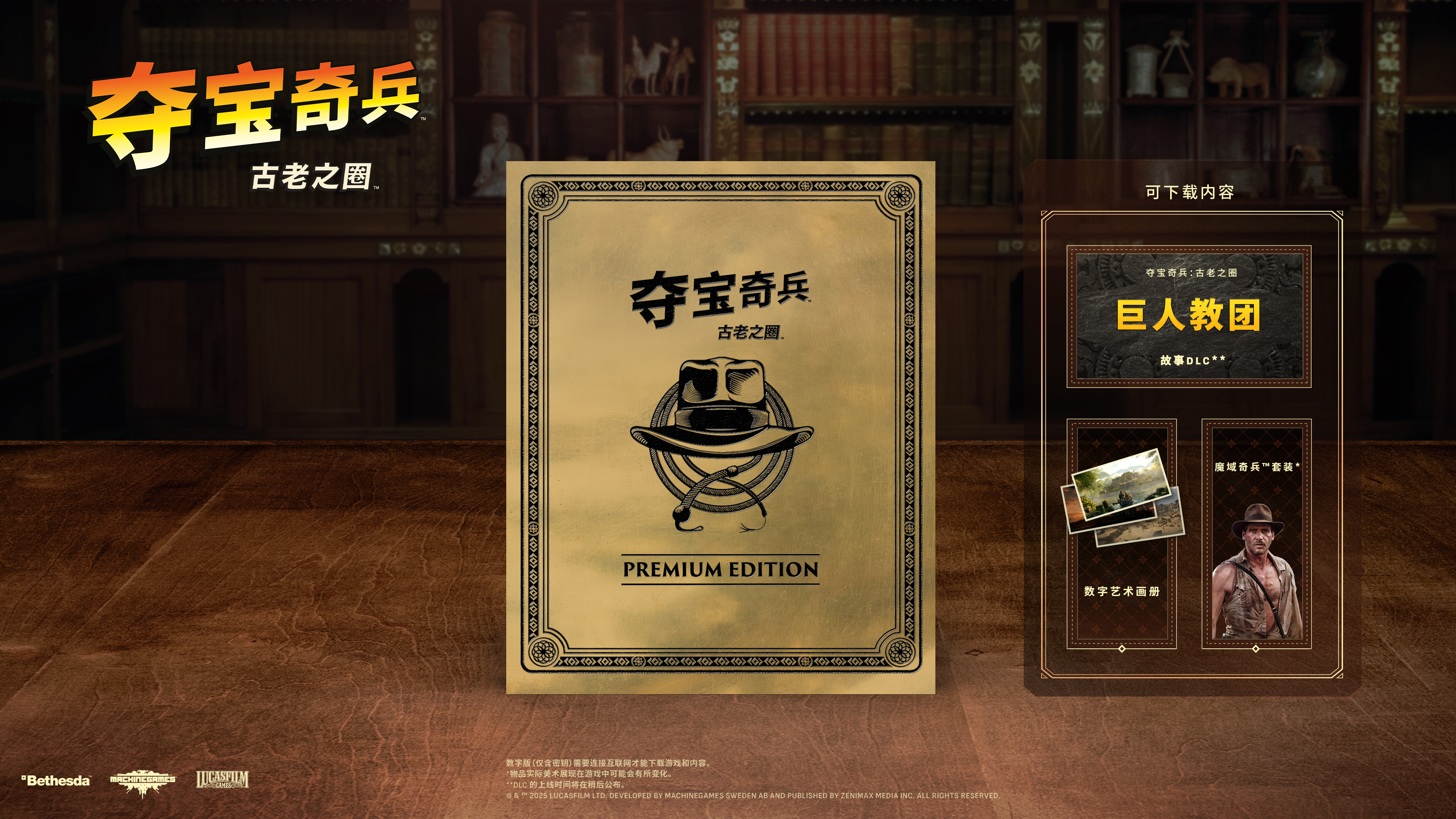 购买豪华版,体验冒险之旅,即可获得基础版游戏、《夺宝奇兵:古老之圈™》巨人教团故事DLC、一份数字艺术画册,及魔域奇兵™套装(《魔域奇兵™》中印第的标志性造型)。